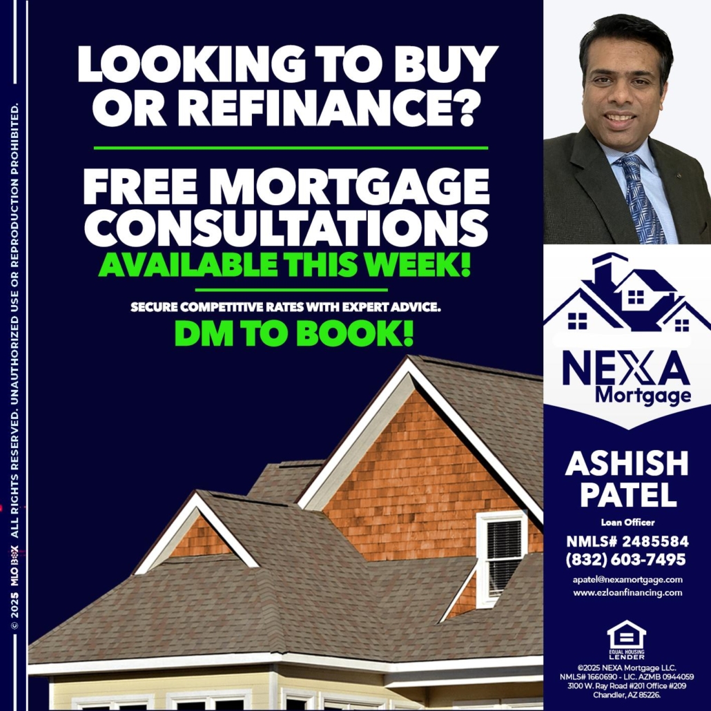 LOOKING TO BUY OR REFINANCE - Ashish Patel -Loan OfficerHi, my name is Ashish Patel. I’m a Loan Officer with NEXA Mortgage LLC., offering personalized mortgage solutions, fast customized quotes, great rates and service with integrity.