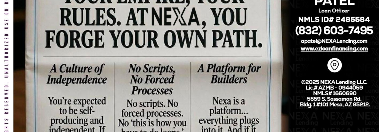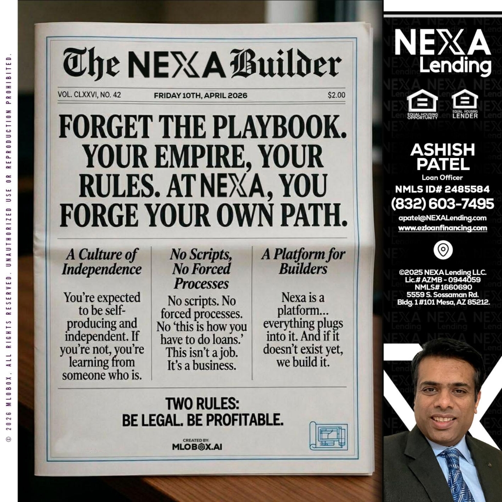 THE NEXA BUILDER - Ashish Patel -Loan OfficerHi, my name is Ashish Patel. I’m a Loan Officer with NEXA Lending LLC., offering personalized mortgage solutions, fast customized quotes, great rates and service with integrity.