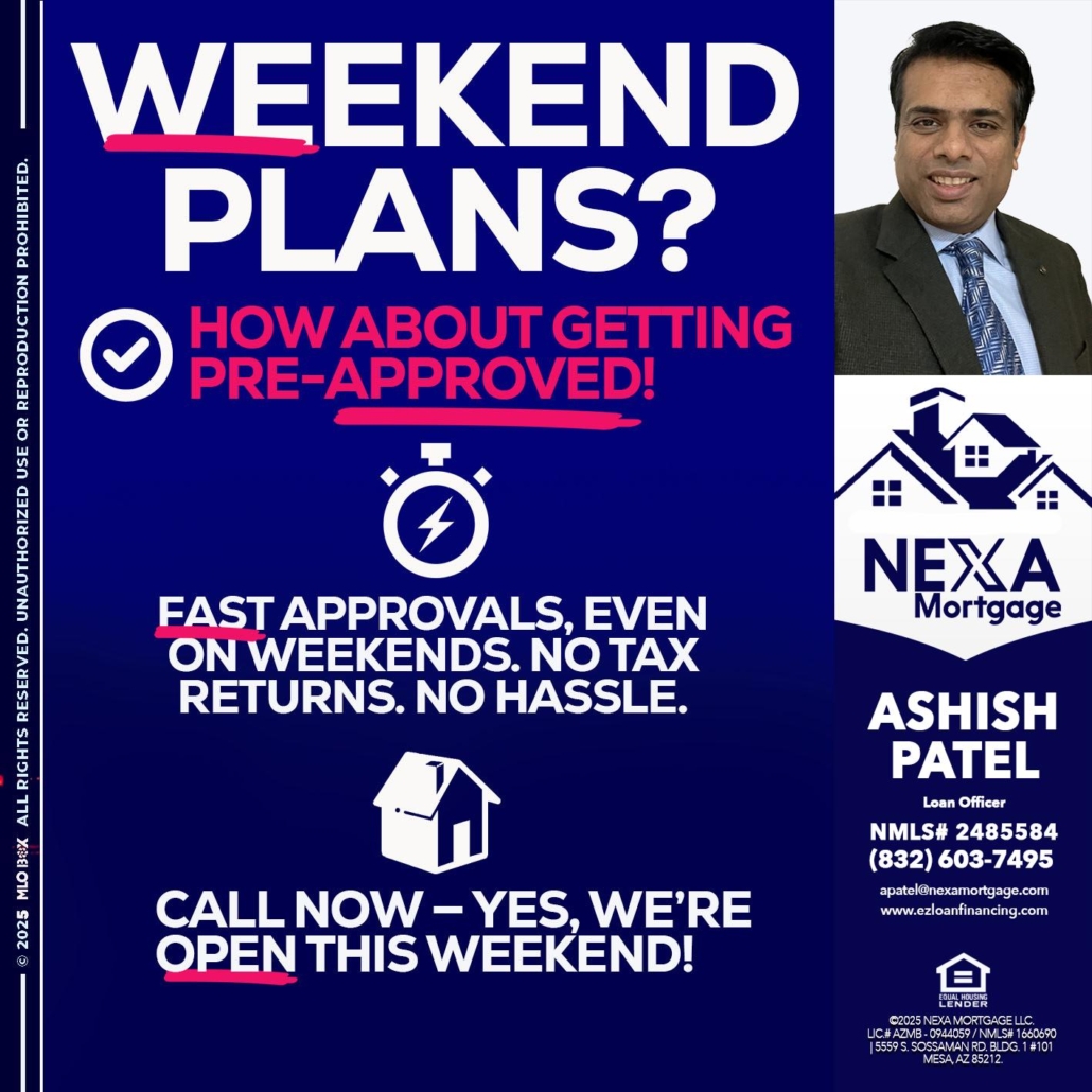 WEEKEND PLANS? - Ashish Patel -Loan OfficerHi, my name is Ashish Patel. I’m a Loan Officer with NEXA Mortgage LLC., offering personalized mortgage solutions, fast customized quotes, great rates and service with integrity.